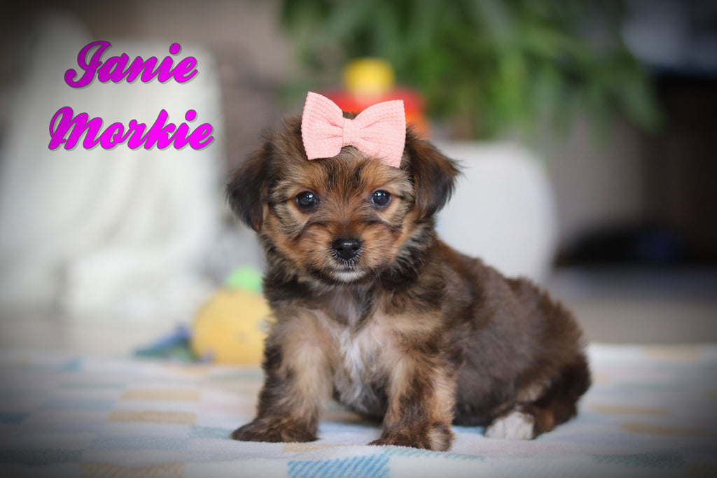 Her mom is a Morkie that weighs 10 pounds and her dad is a Yorkshire Terrier that weighs 10 pounds, so Janie should be the perfect size for anyone who wants a small, cuddly lap pup!