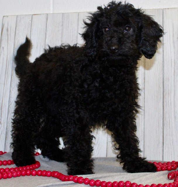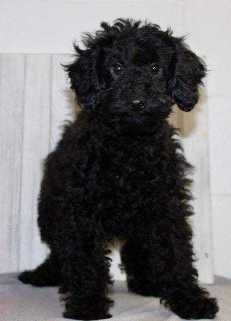 His mom is an F1B Mini Labradoodle that weighs 24 pounds and his dad is a Mini Poodle that weighs 18 pounds -making him exceptional for families looking for an intelligent, allergy friendly pup!