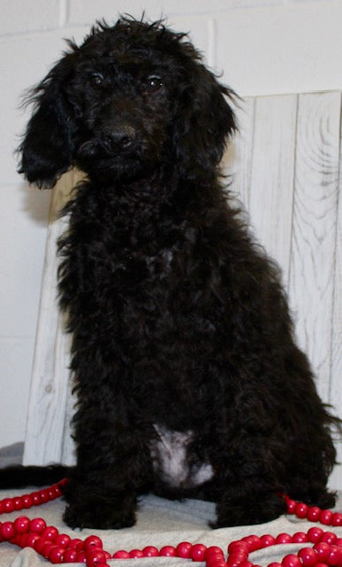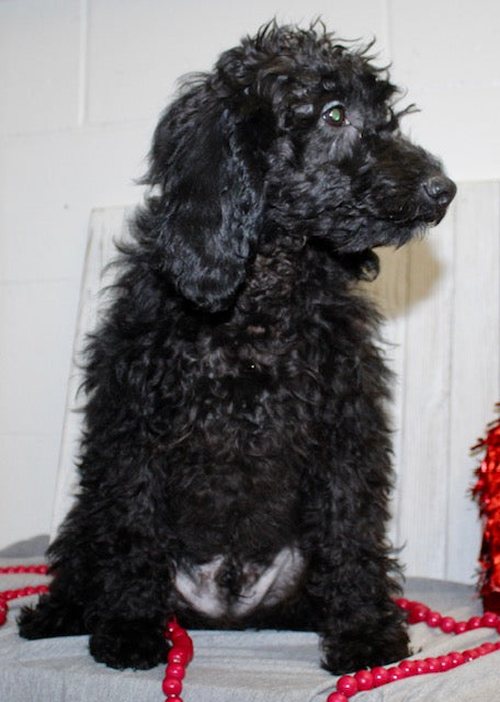 His mom is an F1B Mini Labradoodle that weighs 24 pounds and his dad is a Mini Poodle that weighs 18 pounds -making him exceptional for families looking for an intelligent, allergy friendly pup!