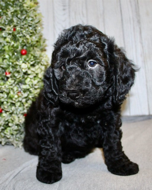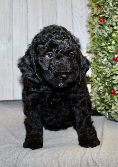 His mom is an F1B Mini Labradoodle that weighs 24 pounds and his dad is a Mini Poodle that weighs 18 pounds -making him exceptional for families looking for an intelligent, allergy friendly pup!