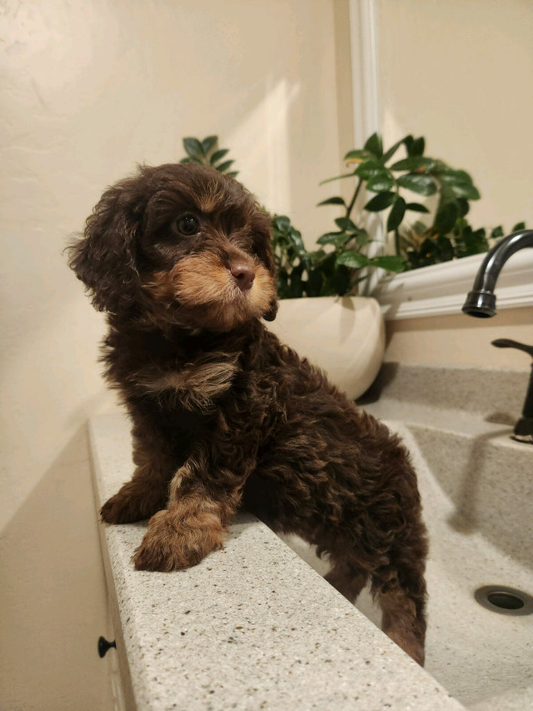 Her mom is a Cavalier that weighs 16 pounds and her dad is a Mini Poodle that weighs 12 pounds - she will be the perfect size for small adventures and cuddling on the couch!