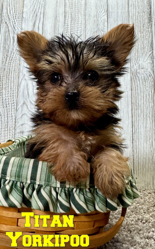 Hey There, My name is Titan! I am a very cute male Yorkipoo puppy! I was born on August 31st, 2025. I am such a sweet little boy! I am looking for my new family, could that be with you? If you choose me I will come home to you vet checked with my vaccinations and deworming up to date and I will also be microchipped. My mom is a Yorkipoo that weighs 6.5 pounds and my dad is a Yorkie that weighs 4 pounds. If you think that I would make the perfect addition to your family, then please call or text to find out more information about me!